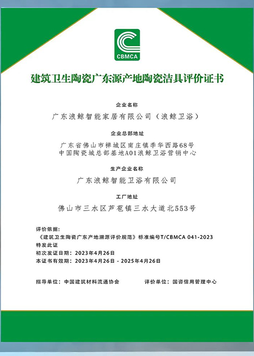 建筑卫生陶瓷广东源产地陶瓷洁具评价证书
